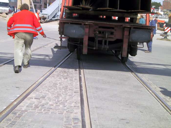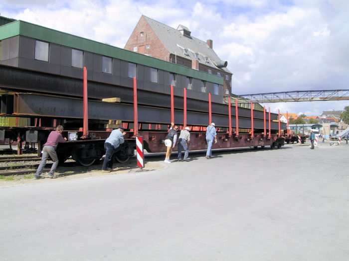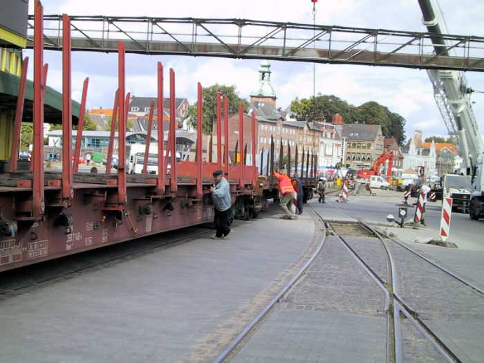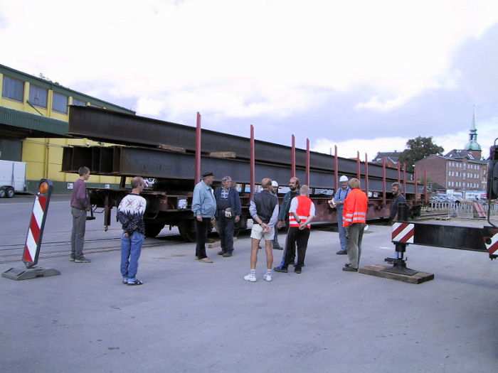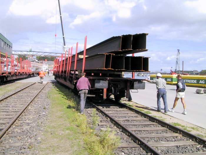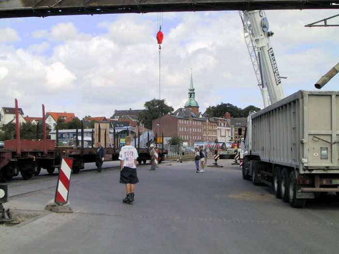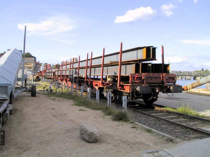 | 23.08.2000 - 12:18 Uhr - Kappeln/Schlei: Neubau einer Klappbrücke Südhafen Links sind die zwei leeren Waggons zu erkennen. In der Bildmitte ist der dritte Waggon auf dem Gleis 3 zu erkennen. Die Träger ragen über das Ende des Waggon hinaus, daher konnte die Diesellok der Museumsbahn (ebenfalls auf Gleis 3) nicht eingesetzt werden. Den angekoppelten Schutzwagen hatte die DB Cargo wieder mitgenommen, da der Stellplatz in Kappeln nicht ausreichte diese hier zu belassen. Das Bremssystem des Wagens wurde per Schlauch mit Luft von der Diesellok gefüllt und es wurde ein Ventil mit Reißleine zum Abbremsen des Wagen angeschlossen. Jetzt wurde das natürliche Gefälle ich Richtung Entladestelle ausgenutzt. Der Wagen musste nur kurz angeschoben werden, dann rollte er von alleine in Richtung Autokran. Foto: Eckhard Schmidt - Kappeln - (C) 2000 |