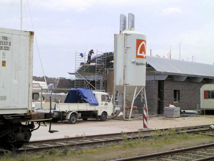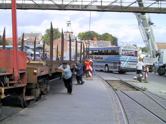 | 23.08.2000 - 12:20 Uhr - Kappeln/Schlei: Neubau einer Klappbrücke Südhafen Geschafft. Der Waggon wurde mit dem Bremsventil, durch ziehen der Reißleine, abgebremst. Der Wagen kann jetzt mit Hilfe des Autokranes (rechts) entladen werden. Foto: Eckhard Schmidt - Kappeln - (C) 2000 |