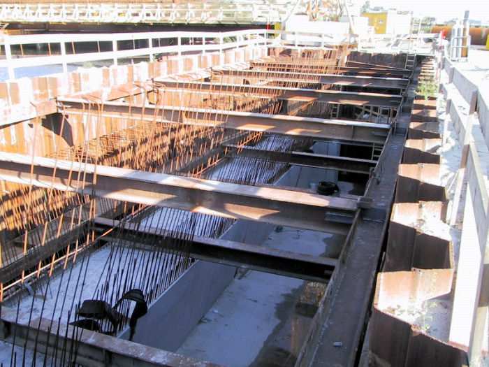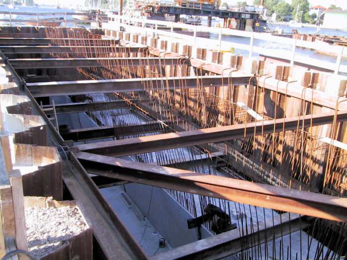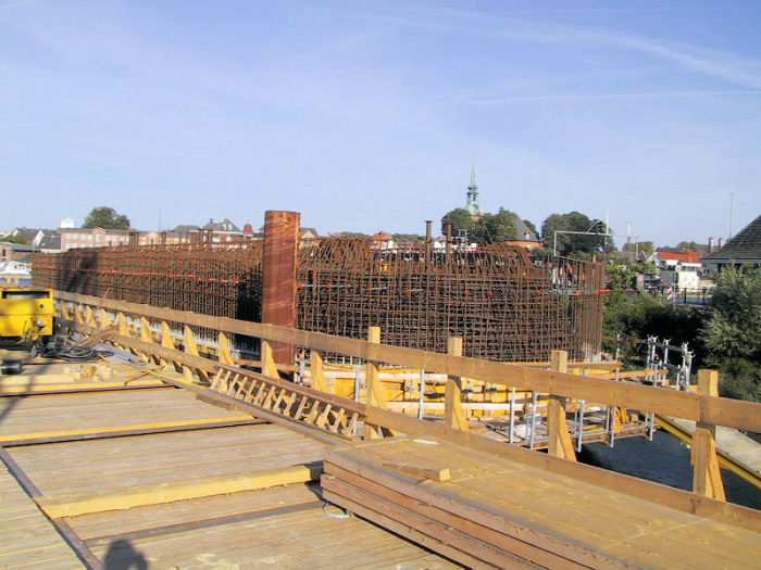 | 27.08.2000 - 8:47 Uhr - Kappeln/Schlei: Neubau einer Klappbrücke Senkkasten Pfeiler 40 Blick von der Hilfsbrücke in Richtung Ponton mit dem Senkkasten für den Pfeiler 40. Der untere Betonring wurde bereits betoniert. Foto: Eckhard Schmidt - Kappeln - (C) 2000 |