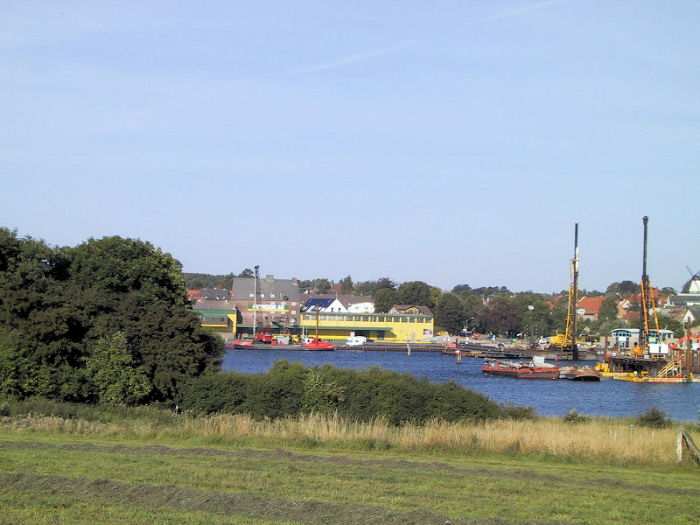 | 24.08.2000 - 14:08 Uhr - Kappeln/Schlei: Neubau einer Klappbrücke Brückenbaustelle Blick vom Südhafen in Richtung Ellenberg. Ein Traditionssegler passiert gerade die Baustelle in Richtung Schleswig. Foto: Eckhard Schmidt - Kappeln - (C) 2000 |