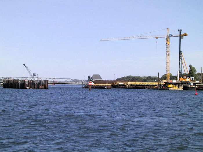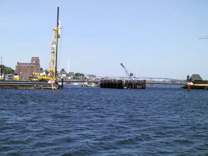 | 27.08.2000 - 9:06 Uhr - Kappeln/Schlei: Neubau einer Klappbrücke Pfeiler 40 und 50 9:00 Uhr -> Brückenöffnungszeit der Drehbrücke. Sportboote passieren die Baustelle in beiden Richtungen. Foto: Eckhard Schmidt - Kappeln - (C) 2000 |