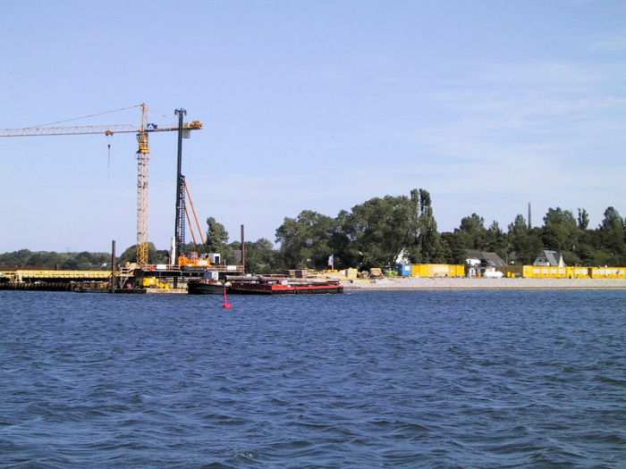 | 24.08.2000 - 14:06 Uhr - Kappeln/Schlei: Neubau einer Klappbrücke Pfeiler 50 Die große Schwimmramme hat angefangen die ersten Stahlträger für das Baugerüst vom Pfeiler 50 in den Schleigrund zu rammen. 14:00 Uhr -> Brückenöffnungszeit der Drehbrücke. Sportboote passieren die Baustelle in beiden Richtungen. Foto: Eckhard Schmidt - Kappeln - (C) 2000 |