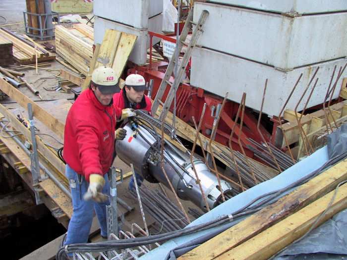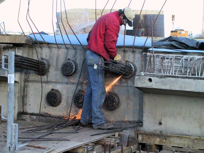| 05.12.2001 - 14:31 Uhr - Kappeln/Schlei: Neubau einer Klappbrücke Brückenüberbau Kappeln Das Spannen der Litzen ist beendet. Die überschüssigen Längen der Spannlitzen werden gerade per Trennschleifer abgetrennt. Die Ankerplatten werden noch mit Deckeln verschlossen werden. Foto: Eckhard Schmidt - Kappeln - (C) 2001 |