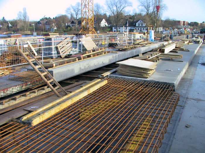 | 05.12.2001 - 11:35 Uhr - Kappeln/Schlei: Neubau einer Klappbrücke Brückenüberbau Ellenberg Der 1. Teilabschnitt der Mittelöffnungs-Kappen vor dem Widerlager 10 wurde ausgeschalt. Eine Mittelöffnung in der Brücke gibt es nur auf der Ellenberger Seite. Die Öffnung geht vom Widerlager 10 bis kurz hinter dem Pfeiler 30. Hinter dem Pfeiler 30 (von Ellenberg aus gesehen) werden die nördliche und südliche Fahrbahn vor den beiden östlichen Klappen zusammengeführt, um später bei der Störung eines Klappenpaares die Fahrbahn wechseln zu können. Siehe auch Kappen für den Brückenüberbau Foto: Eckhard Schmidt - Kappeln - (C) 2001 |
