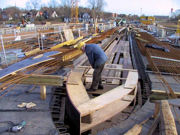 | 05.12.2001 - 11:36 Uhr - Kappeln/Schlei: Neubau einer Klappbrücke Brückenüberbau Ellenberg Blick auf das Ende der Mittelöffnungs-Kappen kurz hinter dem Pfeiler 30. Hier ist die Schalung etwas aufwendiger. Siegfried Galla (Bild) und Andreas Andresen sind dabei die Schalung für diesen Bereich zu erstellen. Foto: Eckhard Schmidt - Kappeln - (C) 2001 |