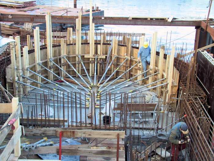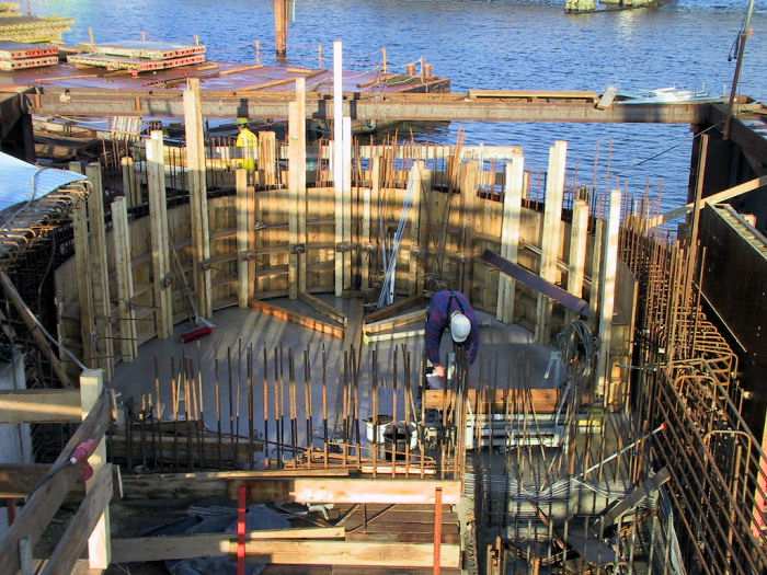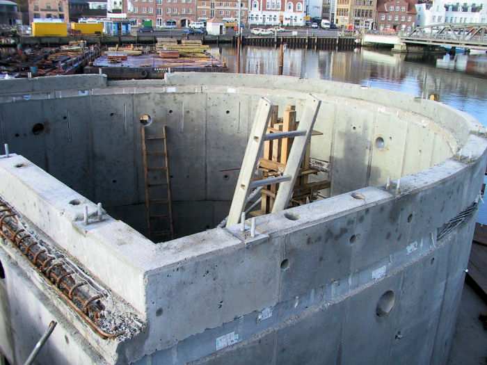 | 06.12.2001 - 14:51 Uhr - Kappeln/Schlei: Neubau einer Klappbrücke Pfeiler 50 Blick auf das Nordende vom Pfeiler 50. Der untere Bereich der Seitenwände des Maschinenraumes wird gerade eingeschalt. Foto: Eckhard Schmidt - Kappeln - (C) 2001 |