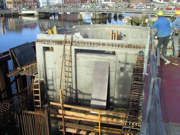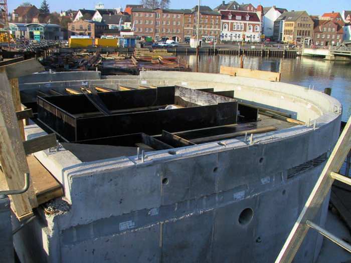 | 06.12.2001 - 11:37 Uhr - Kappeln/Schlei: Neubau einer Klappbrücke Pfeiler 50 Blick auf das Nordende vom Pfeiler 50. Der untere Bereich der Seitenwände des Maschinenraumes wird gerade eingeschalt. Foto: Eckhard Schmidt - Kappeln - (C) 2001 |