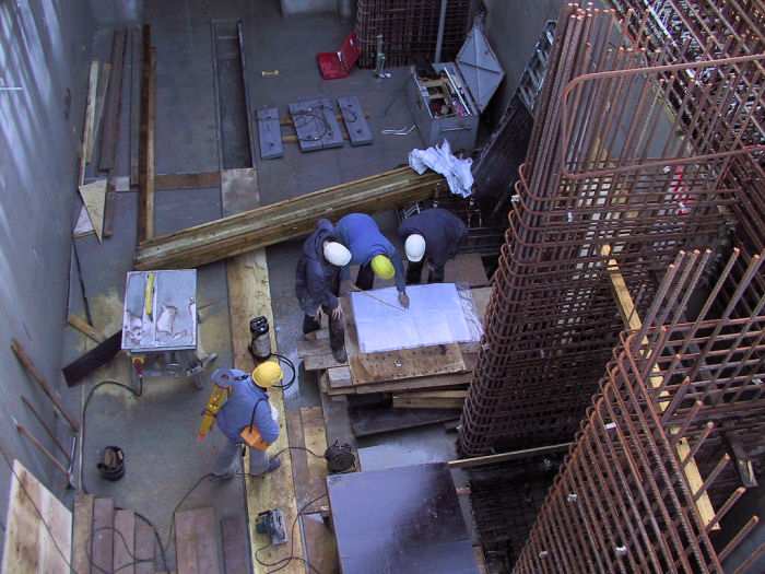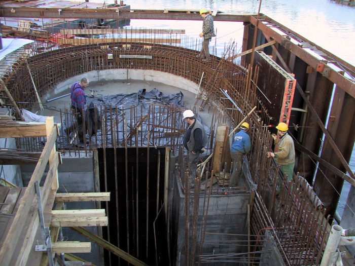 | 05.12.2001 - 11:50 Uhr - Kappeln/Schlei: Neubau einer Klappbrücke Pfeiler 40 Blick von oben in das Innere des Klappenkellers. Hier werden gerade Schalpläne studiert. Die Fundament-Pfeiler für die Klappenlager (rechts) sollen eingeschalt werden. Das Treppenhaus (Zugang zum Klappenkeller) befindet sich oben im Bild. Foto: Eckhard Schmidt - Kappeln - (C) 2001 |