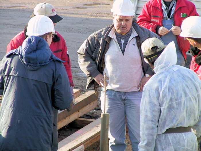 | 06.12.2001 - 12:25 Uhr - Kappeln/Schlei: Neubau einer Klappbrücke Brückenüberbau Kappeln Die Hüllrohre der Spannlitzen werden mit Zementmörtel verpresst. Es wird gerade noch einmal die Fließfähigkeit der fertigen Mischung überprüft. In einen Messingzylinder wurde eine Probe des Zementmörtels eingefüllt. Dann wurde von oben ein Kolben in den Zylinder eingeführt. Dieser sinkt durch die Mischung nach unten und muss einen bestimmten Weg in einer vorgegebenen Zeit zurücklegen. Foto: Eckhard Schmidt - Kappeln - (C) 2001 |