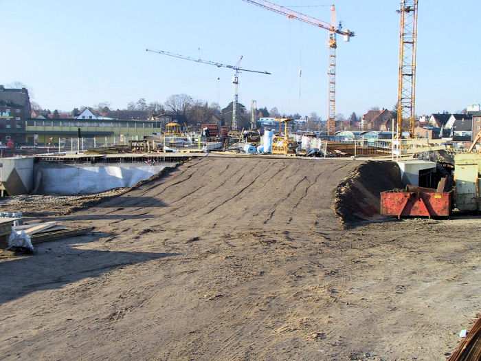 | 05.12.2001 - 11:25 Uhr - Kappeln/Schlei: Neubau einer Klappbrücke Brückenüberbau Ellenberg Blick von Osten auf das Widerlager 10. Hier wird gerade eine provisorische Rampe aufgeschüttet, damit der Brückenüberbau von Fahrzeugen befahren werden kann. Foto: Eckhard Schmidt - Kappeln - (C) 2001 |