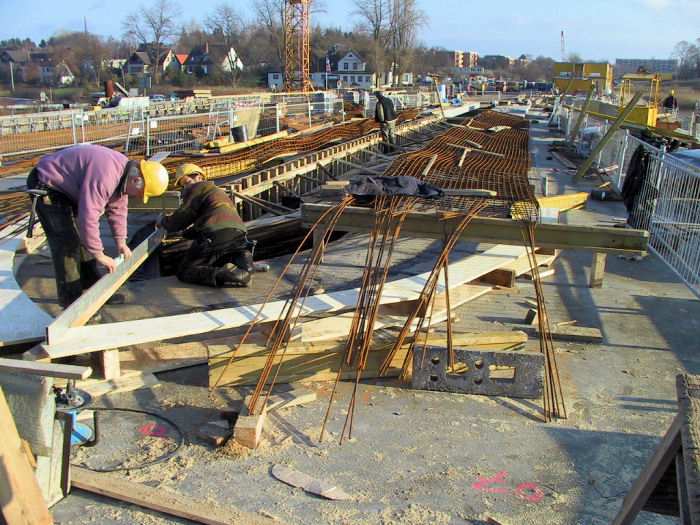 | 07.12.2001 - 11:30 Uhr - Kappeln/Schlei: Neubau einer Klappbrücke Brückenüberbau Ellenberg Blick auf das Ende der Mittelöffnungs-Kappen kurz hinter dem Pfeiler 30. Hier ist die Schalung etwas aufwendiger. Siegfried Galla und Andreas Andresen sind dabei die Schalung für diesen Bereich zu erstellen. Foto: Eckhard Schmidt - Kappeln - (C) 2001 |
