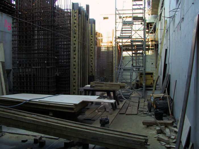 | 05.12.2001 - 11:46 Uhr - Kappeln/Schlei: Neubau einer Klappbrücke Pfeiler 40 Blick auf das Nordende vom Pfeiler 40. Die Seitenwände des Maschinenraumes sind fertig betoniert und bereits ausgeschalt. In der südlichen Seitenwand des Maschinenraumes erkennt man die Durchbrüche für die Elektrokabel und Hydraulikleitungen zum Klappenkeller hin. Der Klappenkeller befindet sich zwischen dem Nordende (Maschinenraum und Brückenwärterhaus) und dem Südende (Treppenhaus) des Klappenpfeilers. Foto: Eckhard Schmidt - Kappeln - (C) 2001 |