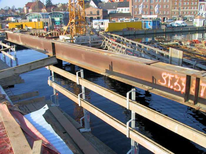 | 07.12.2001 - 11:58 Uhr - Kappeln/Schlei: Neubau einer Klappbrücke Brückenüberbau Kappeln Der Beton der Brückenträger ist zu 100% gespannt. Jetzt kann das Traggerüst unterhalb des Brückenüberbaus abgebaut werden. Anschließend können die Schalungsmodule abgesenkt und seitlich herausgefahren werden. Es wird ein Doppel-T-Träger des Traggerüstes mit Hilfe des Turmdrehkranes angehoben. Foto: Eckhard Schmidt - Kappeln - (C) 2001 |