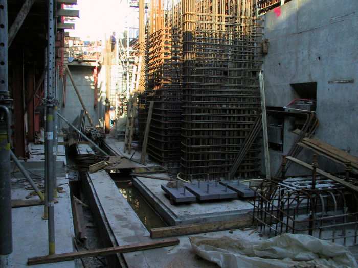 | 07.12.2001 - 12:03 Uhr - Kappeln/Schlei: Neubau einer Klappbrücke Pfeiler 50 Ich befinde mich im Klappenkeller des Pfeiler 50 und blicke von der Mitte des Kellers in Richtung Norden (Maschinenraum). Hier wird noch an der Bewehrung der Fundament-Pfeiler für die Drehlager der beiden westlichen Klappen gearbeitet. Siehe auch: Anordnung der Klappenpaare A/B und C/D mit den zugehörigen Komponenten Foto: Eckhard Schmidt - Kappeln - (C) 2001 |