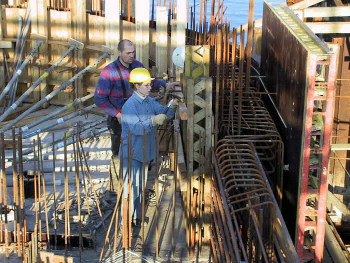 | 07.12.2001 - 12:07 Uhr - Kappeln/Schlei: Neubau einer Klappbrücke Pfeiler 50 Blick auf das Nordende vom Pfeiler 50. Der untere Bereich der Seitenwände des Maschinenraumes wird gerade eingeschalt. Unterstützt wird Stefan Mordhorst dabei von einer Praktikantin. Foto: Eckhard Schmidt - Kappeln - (C) 2001 |