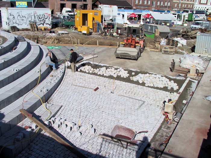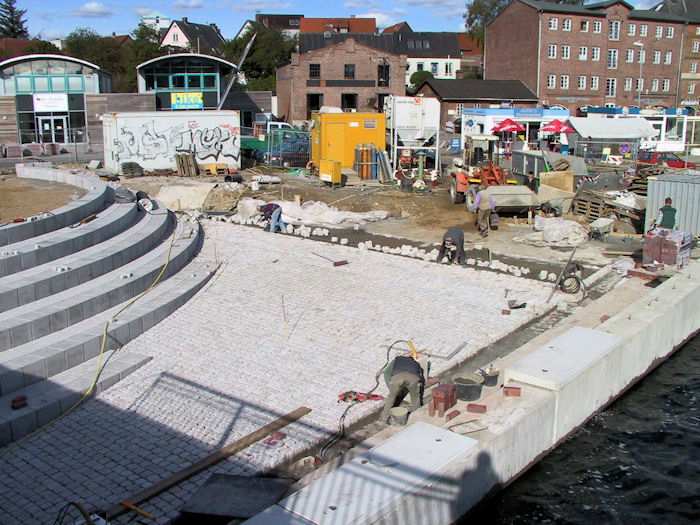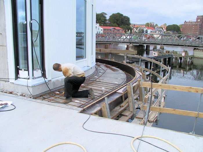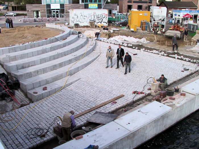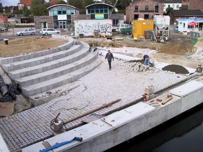 | 27.09.2002 - 10:42 Uhr - Kappeln/Schlei: Neubau einer Klappbrücke Südhafen / Widerlager 70 / Unterführung Nördliche Eingangsrampe Blick von der Brücke auf die nördliche Rampe und Sitztreppe. Foto: Eckhard Schmidt - Kappeln - (C) 2002 |