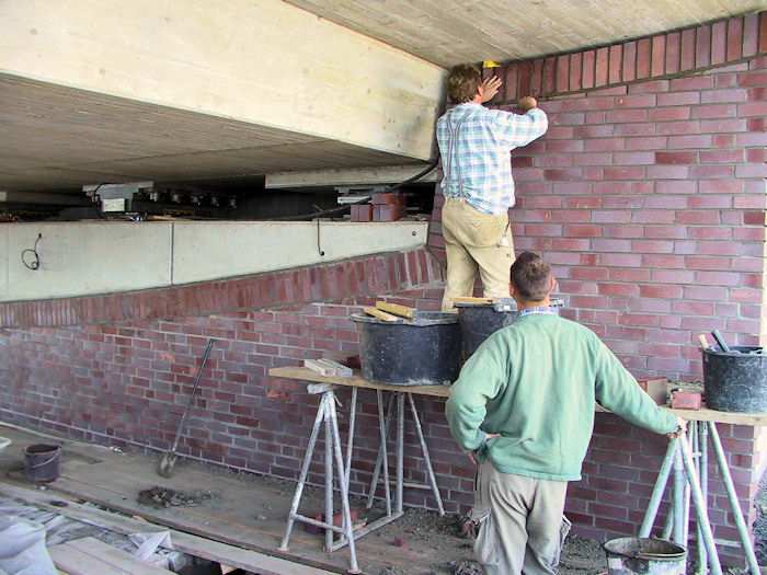 | 25.09.2002 - 11:55 Uhr - Kappeln/Schlei: Neubau einer Klappbrücke Südhafen / Widerlager 70 / Unterführung Übergang: Südliche Eingangsrampe - Unterführung Maurer verblenden die Betonwand des Widerlager 70 südlich der Eingangstür mit roten Klinkersteinen. Süden <--- Lager ---> Norden Osten (Unterführung) Schlei Foto: Eckhard Schmidt - Kappeln - (C) 2002 |