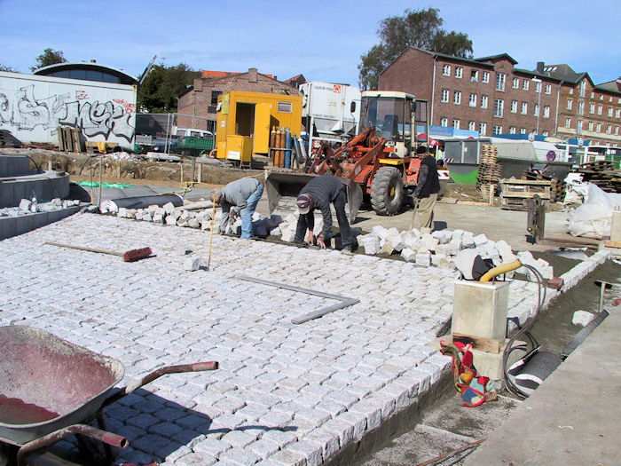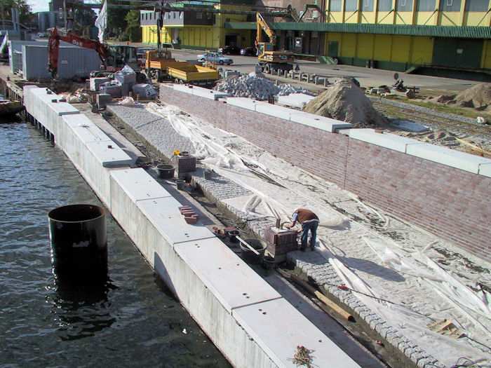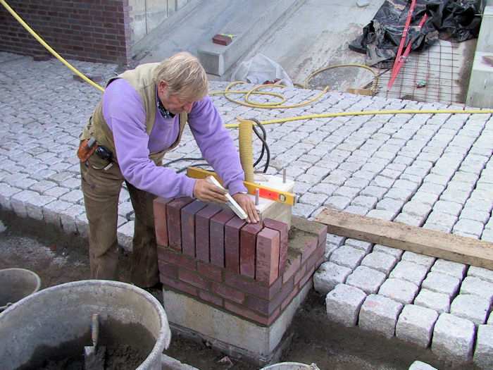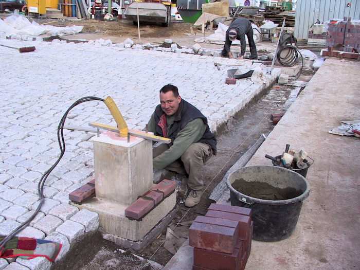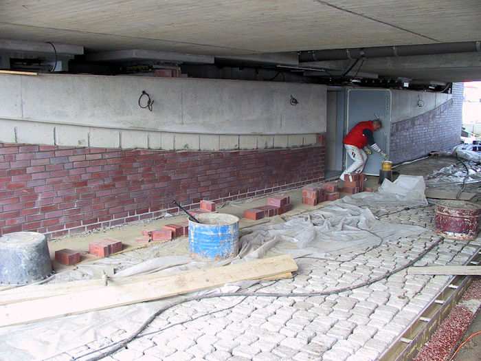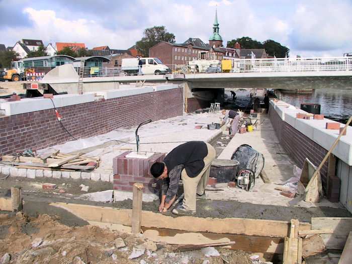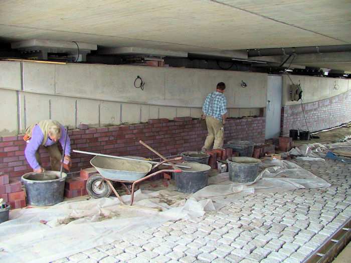 | 27.09.2002 - 10:46 Uhr - Kappeln/Schlei: Neubau einer Klappbrücke Südhafen / Widerlager 70 / Unterführung Nördliche Eingangsrampe Die Betonsockel für die Straßenlampen werden auch mit roten Klinkersteinen verblendet. Foto: Eckhard Schmidt - Kappeln - (C) 2002 |