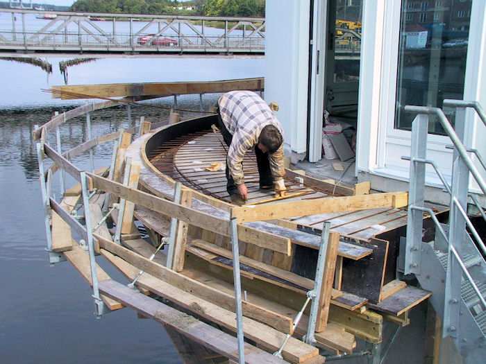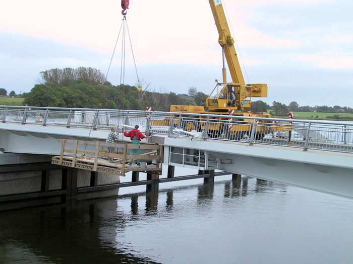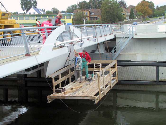 | 25.09.2002 - 9:13 Uhr - Kappeln/Schlei: Neubau einer Klappbrücke Brückenklappen Nördliches Klappenpaar C/D Vorne an den Klappenspitzen müssen seitlich Löcher für die Kabeldurchführung der Spitzenbeleuchtung gebohrt werden. Die Arbeiten werden von einem Gerüst ausgeführt, welches am Lastseil eines Kranes hängt. Foto: Eckhard Schmidt - Kappeln - (C) 2002 |
