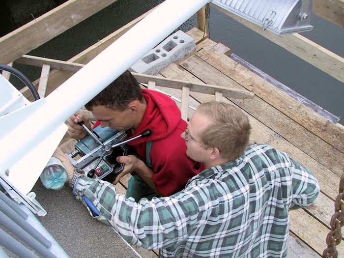 | 25.09.2002 - 11:33 Uhr - Kappeln/Schlei: Neubau einer Klappbrücke Brückenklappen Südliches Klappenpaar A/B Hier wird gerade ein Loch gebohrt. Mit Hilfe einer Flasche wird Kühlflüssigkeit zugeführt. Foto: Eckhard Schmidt - Kappeln - (C) 2002 |