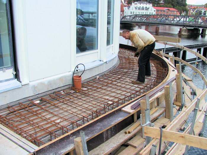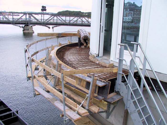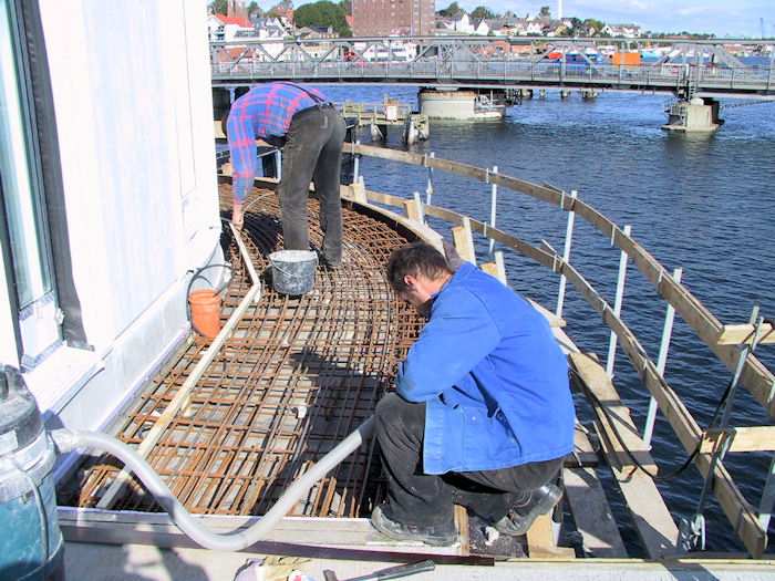 | 26.09.2002 - 11:01 Uhr - Kappeln/Schlei: Neubau einer Klappbrücke Pfeiler 40 - Nordende Westseite des Zugangs zum Brückenwärterhaus Eisenflechter sind gerade dabei in die Schalung der Kappe des Zugangs zum Brückenwärterhaus die Bewehrung einzubringen. Foto: Eckhard Schmidt - Kappeln - (C) 2002 |