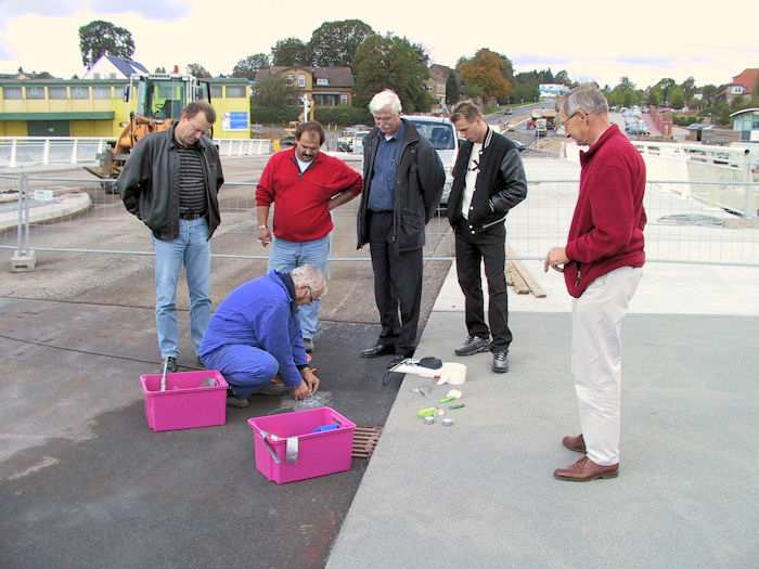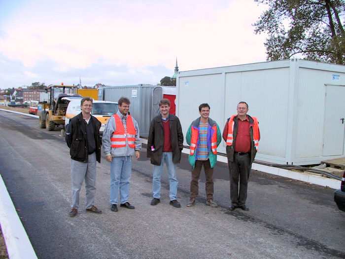 | 26.09.2002 - 11:13 Uhr - Kappeln/Schlei: Neubau einer Klappbrücke Straßenbau Ellenberg Bauleitung Norbert Seils (rechts) vom Straßenbauamt Flensburg mit den Mitarbeitern der beteiligen Firmen Ditting, SAW und Nordlabor. Foto: Eckhard Schmidt - Kappeln - (C) 2002 |