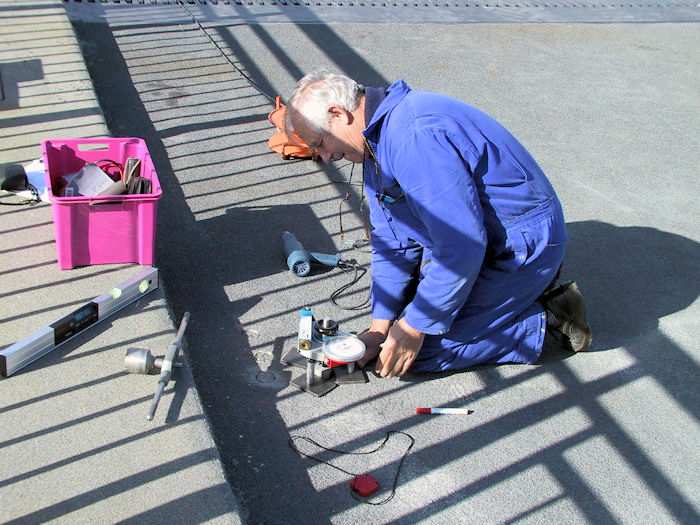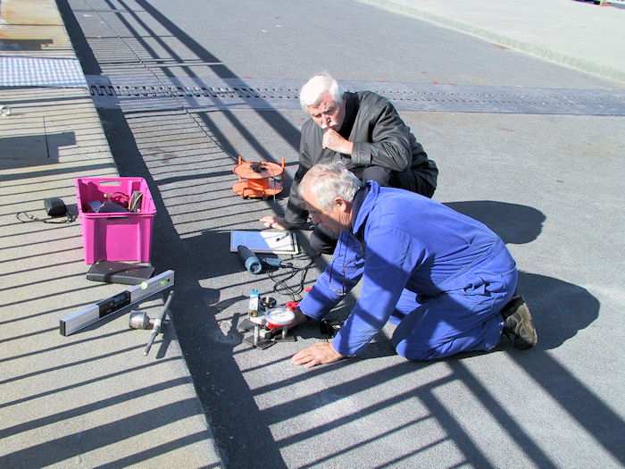 | 26.09.2002 - 12:08 Uhr - Kappeln/Schlei: Neubau einer Klappbrücke Brückenklappen Nördliches Klappenpaar C/D An verschiedenen Stellen aller vier Brückenklappen wird erneut die Haftfähigkeit der Fahrbahnbeschichtung überprüft. Foto: Eckhard Schmidt - Kappeln - (C) 2002 |
