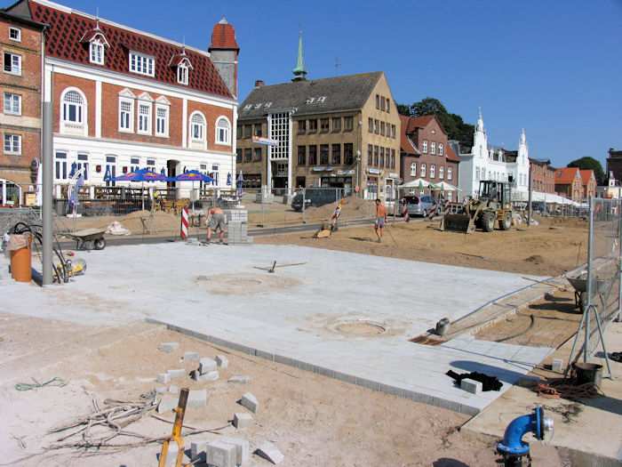 | 04.08.2004 - 10:44 Uhr - Kappeln/Schlei: Nordhafen Umgestaltung des Hafenvorfeldes: Schleibrücke / Hohlweg bis Fährberg Am Hafen Pflasterarbeiten Foto: Eckhard Schmidt - Kappeln - (C) 2004 |