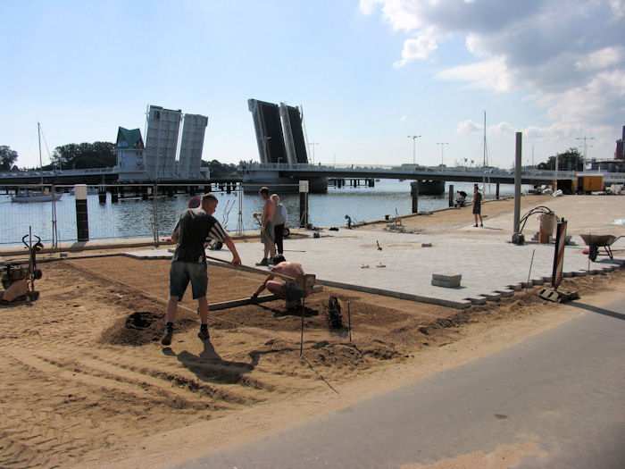 | 04.08.2004 - 10:42 Uhr - Kappeln/Schlei: Nordhafen Umgestaltung des Hafenvorfeldes: Schleibrücke / Hohlweg bis Fährberg Am Hafen Pflasterarbeiten Foto: Eckhard Schmidt - Kappeln - (C) 2004 |