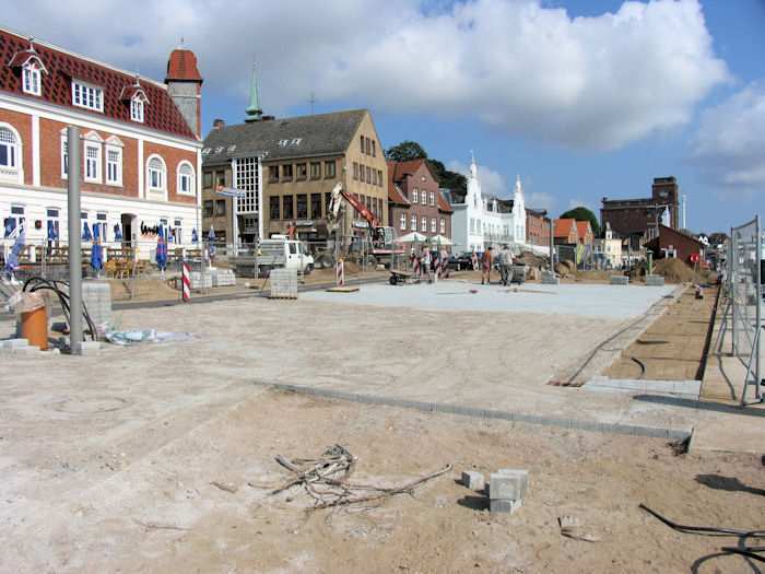 | 06.08.2004 - 10:25 Uhr - Kappeln/Schlei: Nordhafen Umgestaltung des Hafenvorfeldes: Schleibrücke / Hohlweg bis Fährberg Hohlweg - Am Hafen Pflasterarbeiten Heute ruht hier die Arbeit. Foto: Eckhard Schmidt - Kappeln - (C) 2004 |