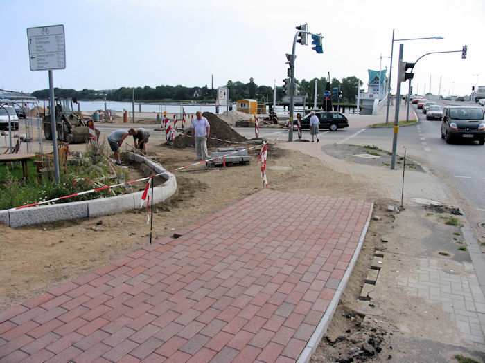| 05.08.2004 - 10:21 Uhr - Kappeln/Schlei: Nordhafen Umgestaltung des Hafenvorfeldes: Schleibrücke / Hohlweg bis Fährberg Hohlweg - Am Hafen Es werden weitere Bordsteine gesetzt. Ein Teil des Radweges wurde mit roten Klinkersteinen gepflastert. Foto: Eckhard Schmidt - Kappeln - (C) 2004 |
