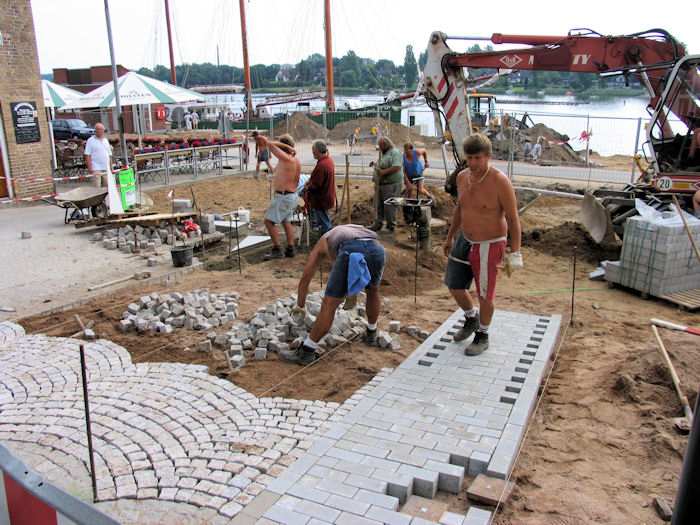 | 06.08.2004 - 10:33 Uhr - Kappeln/Schlei: Nordhafen Umgestaltung des Hafenvorfeldes: Schleibrücke / Hohlweg bis Fährberg Unterer Fährberg Pflasterarbeiten Foto: Eckhard Schmidt - Kappeln - (C) 2004 |