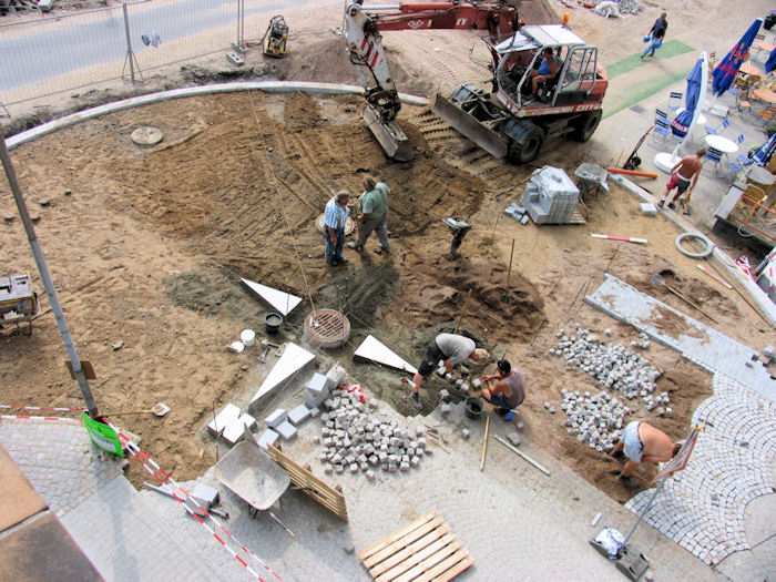 | 06.08.2004 - 10:42 Uhr - Kappeln/Schlei: Nordhafen Umgestaltung des Hafenvorfeldes: Schleibrücke / Hohlweg bis Fährberg Unterer Fährberg Pflasterarbeiten Von oben kann man den kreisförmigen Auslauf des Fährberges im Hafenvorfeld und die Kompassrose im Steinpflaster gut erkennen. Foto: Eckhard Schmidt - Kappeln - (C) 2004 |