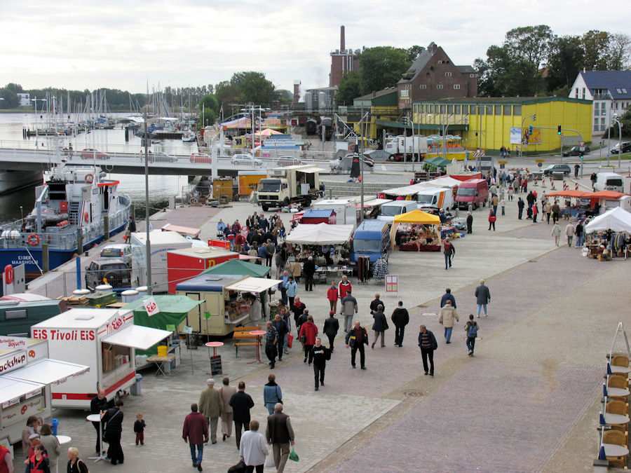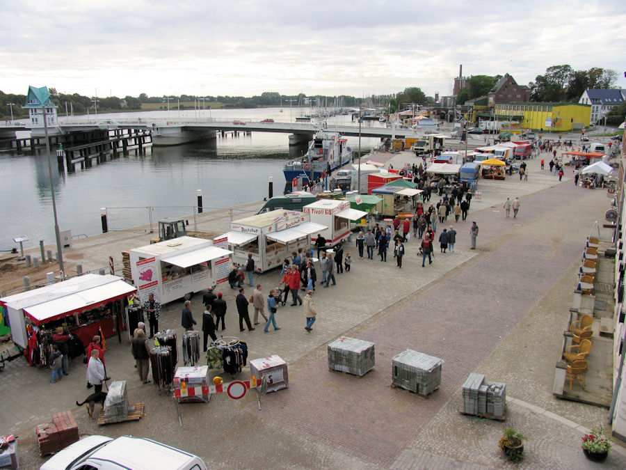 | 26.09.2004 - 11:06 Uhr - Kappeln/Schlei: Nordhafen 1. Fischmarkt auf dem neu gestalteten Hafenvorfeld Ansicht von der Schleibrücke Foto: Eckhard Schmidt - Kappeln - (C) 2004 |