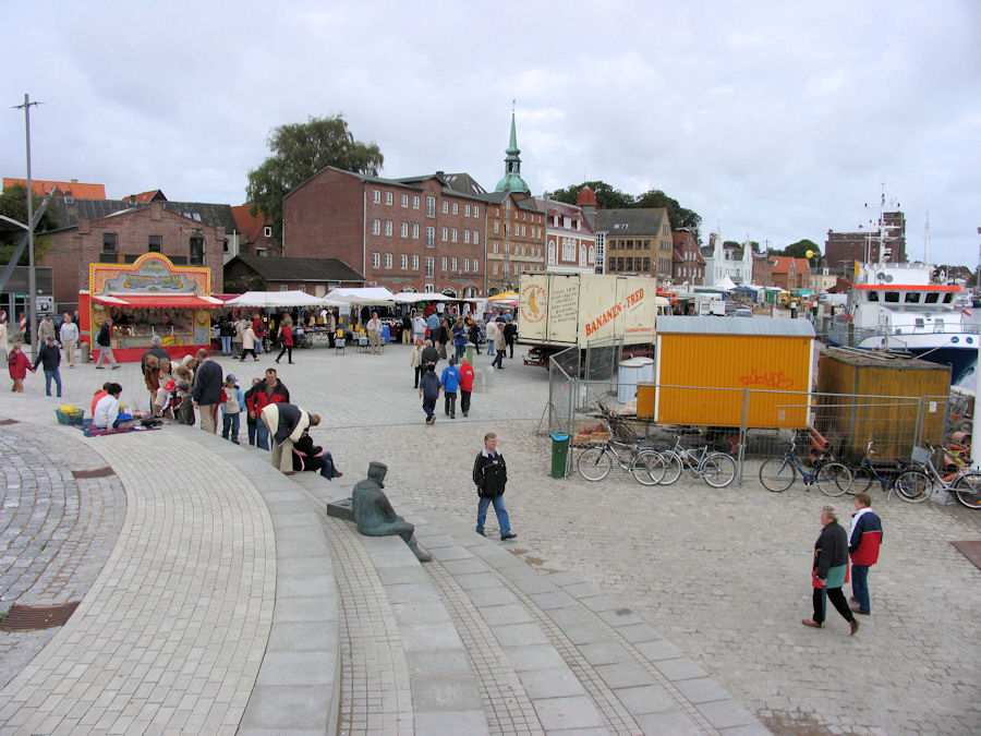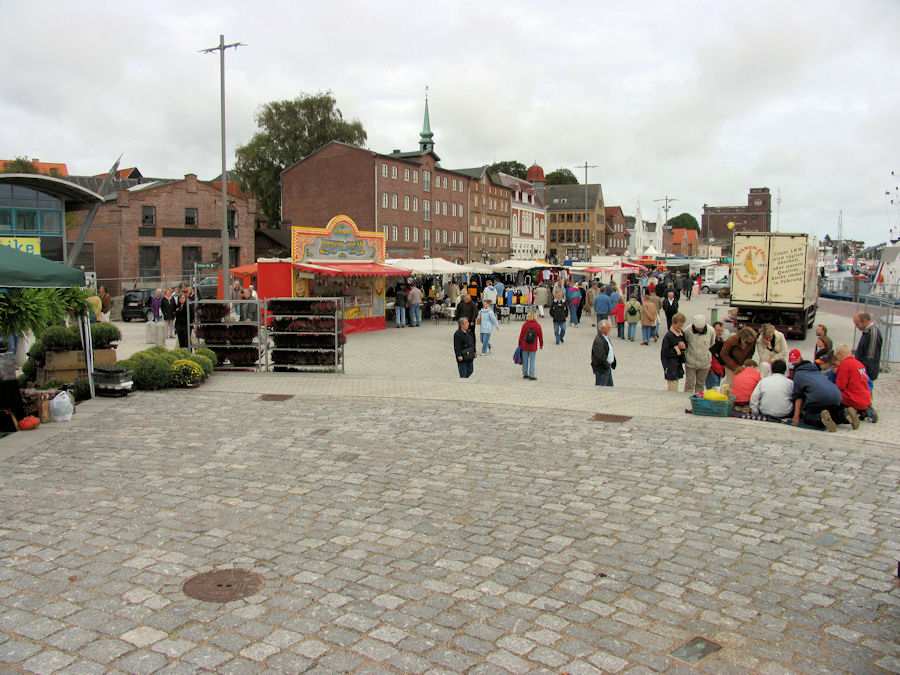 | 26.09.2004 - 11:07 Uhr - Kappeln/Schlei: Nordhafen 1. Fischmarkt auf dem neu gestalteten Hafenvorfeld Ansicht von der Schleibrücke Foto: Eckhard Schmidt - Kappeln - (C) 2004 |
