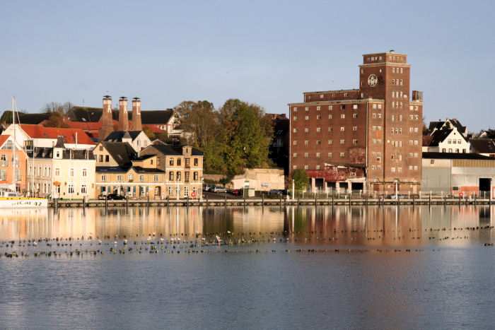 | 10.11.2006 - 8:39 Uhr - Kappeln/Schlei: Nordhafen Blick von Ellenberg in Richtung Gastliegerhafen. Rechts im Bild der ehemalige GAG-Silo aus dem Jahre 1936. Links im Bild die drei Schornsteine der Fischräucherei Föh. Foto: Eckhard Schmidt - Kappeln - (C) 2006 |