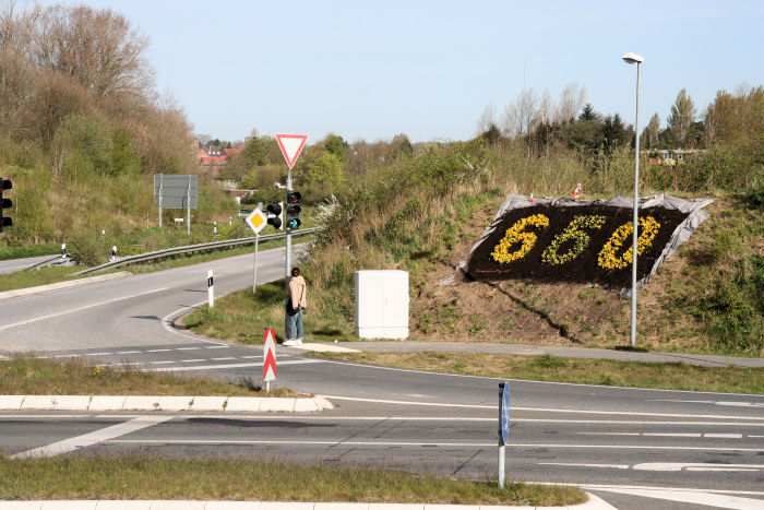 | 17.04.2007 - 9:26 Uhr - Kappeln/Schlei: Ellenberg - Kreuzung Aral-Tankstelle Kappeln: 650 oder 660 Jahre - das ist hier die Frage ? An der Kreuzung der B203 in Höhe der Aral-Tankstelle in Ellenberg wurde die Jahreszahl 650" mit Stiefmütterchen gepflanzt. Blick vom GAG-Silo in Loitmark auf die Kreuzung. Foto: Eckhard Schmidt - Kappeln - (C) 2007 |