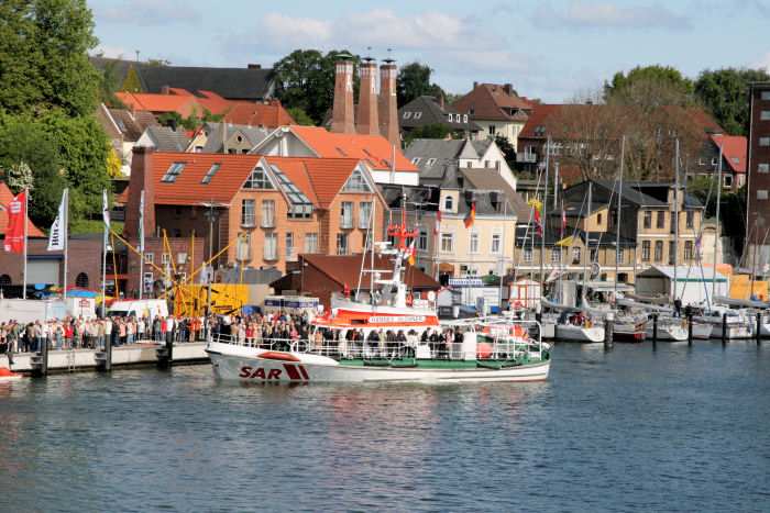 | 17.05.2007 - 10:08 Uhr - Kappeln/Schlei: Heringstage 2007 Heringswette Im Nordhafen hat der Rettungskreuzer HANNES GLOGNER festgemacht, um die Wettgäste an Bord zu nehmen. Es ist das Gewicht der Heringe im Netz beim Heringszaun zu schätzen. Bemerkung: Die NIS RANDERS befindet sich zur Zeit in der Werft. Foto: Eckhard Schmidt - Kappeln - (C) 2007 |