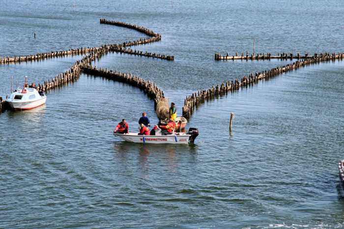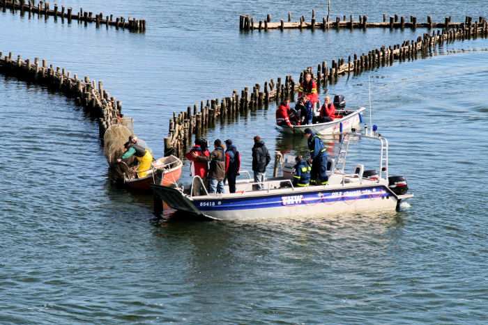 | 17.05.2007 - 10:26 Uhr - Kappeln/Schlei: Heringstage 2007 Heringswette Beim Heringszaun werden Gerhard Zander und Peter Becker das Netz aus dem Wasser herausholen. Foto: Eckhard Schmidt - Kappeln - (C) 2007 |