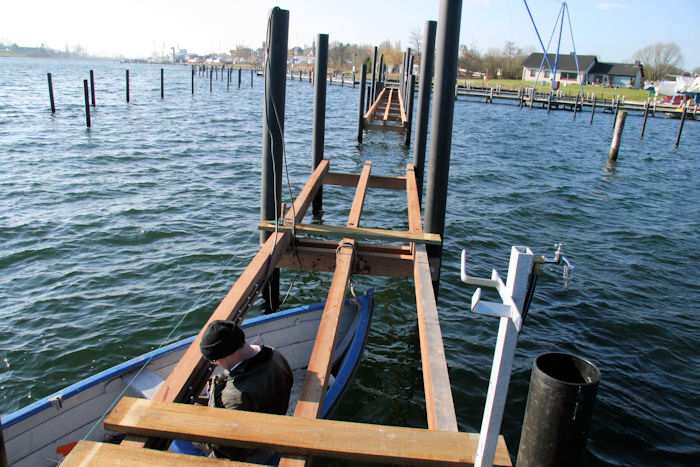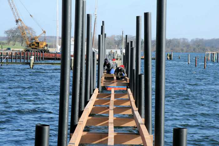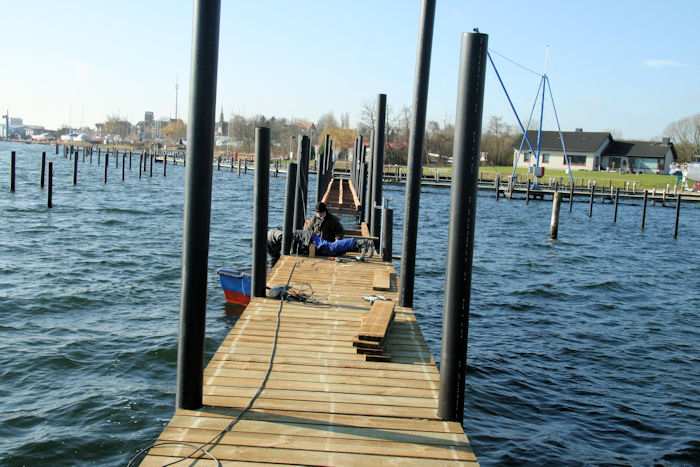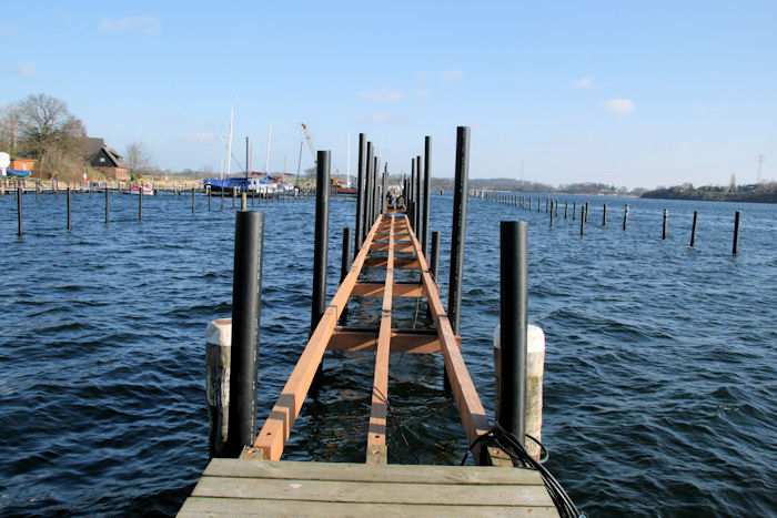 | 10.03.2008 - 9:54 Uhr - Kappeln/Schlei: Grauhöft - Henningsen & Steckmest Erneuerung eines Brückensteges Beim südlichen Teil des nördlichen Steges sind noch bei zwei Fächern Bretter auf die Längsbalken zu schrauben. Jetzt ist die Durchfahrt zwischen dem nördlichen und südlichen Teil des äußeren Steges gut zu erkennen. Foto: Eckhard Schmidt - Kappeln - (C) 2008 |