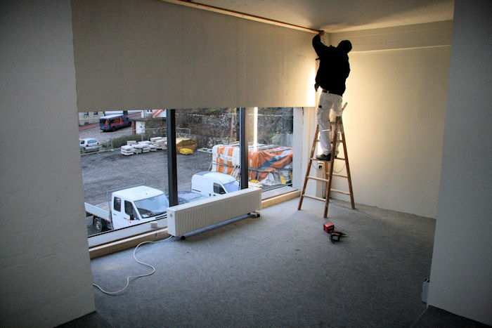| 20.01.2009 - 9:05 Uhr - Kappeln/Schlei: PK-Speicher im Nordhafen 1. Obergeschoss - Südseite In der Südostecke des 1. Obergeschosses entsteht gerade ein Büro. Klaus Lausen befestigt ein Brett für eine Gardine an der Decke. Foto: Eckhard Schmidt - Kappeln - (C) 2009 |