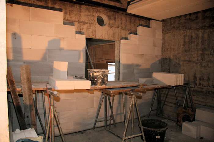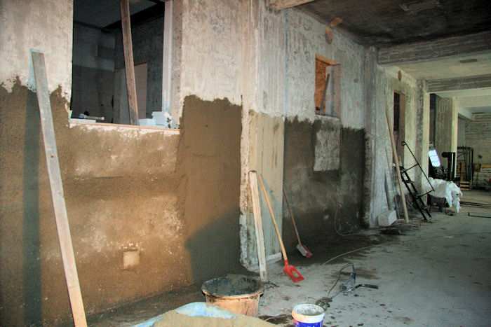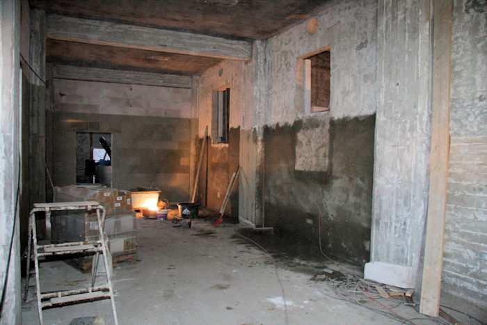 | 20.01.2009 - 9:10 Uhr - Kappeln/Schlei: PK-Speicher im Nordhafen Erdgeschoss - Südseite Es werden gerade die Wände zu den Zellen 2 und 3 (rechts) verputzt. Westen Süden <--- Südseite ---> Norden Foto: Eckhard Schmidt - Kappeln - (C) 2009 |