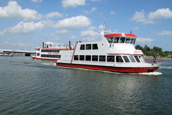 | 20.05.2009 - 13:50 Uhr - Kappeln/Schlei: Heringstage 2009 Einlaufen des Minenjagdbootes LABOE Brückenöffnung 13:45 Uhr Die beiden Kappelner Fahrgastschiffe SCHLEI PRINCESS und WIKINGER PRINCESS passieren einander. Foto: Eckhard Schmidt - Kappeln - (C) 2009 |