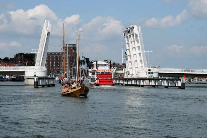 | 20.05.2009 - 13:50 Uhr - Kappeln/Schlei: Heringstage 2009 Einlaufen des Minenjagdbootes LABOE Brückenöffnung 13:45 Uhr Die SCHLEI PRINCESS passiert die Brücke, um im Nordhafen an ihrem Liegeplatz festzumachen. Foto: Eckhard Schmidt - Kappeln - (C) 2009 |