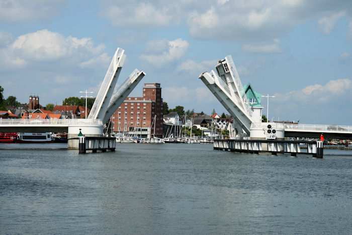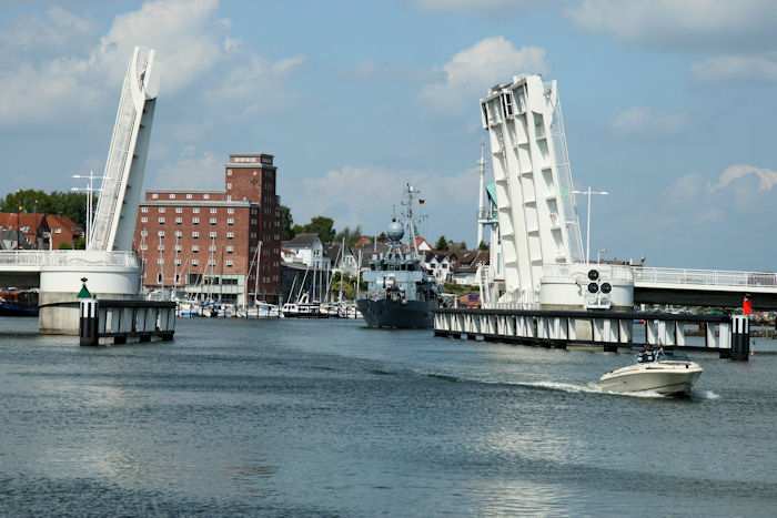 | 20.05.2009 - 14:04 Uhr - Kappeln/Schlei: Heringstage 2009 Einlaufen des Minenjagdbootes LABOE Brückenöffnung 14:00 Uhr Zügig passiert die LABOE die Schleibrücke. Foto: Eckhard Schmidt - Kappeln - (C) 2009 |