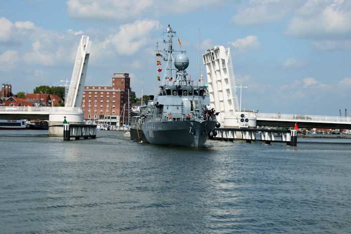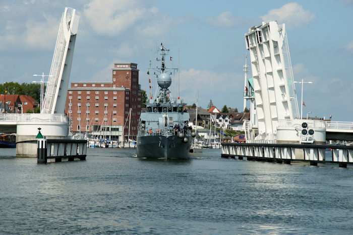 | 20.05.2009 - 14:06 Uhr - Kappeln/Schlei: Heringstage 2009 Einlaufen des Minenjagdbootes LABOE Brückenöffnung 14:00 Uhr Die LABOE dreht jetzt bei. Foto: Eckhard Schmidt - Kappeln - (C) 2009 |