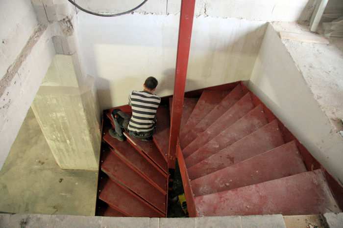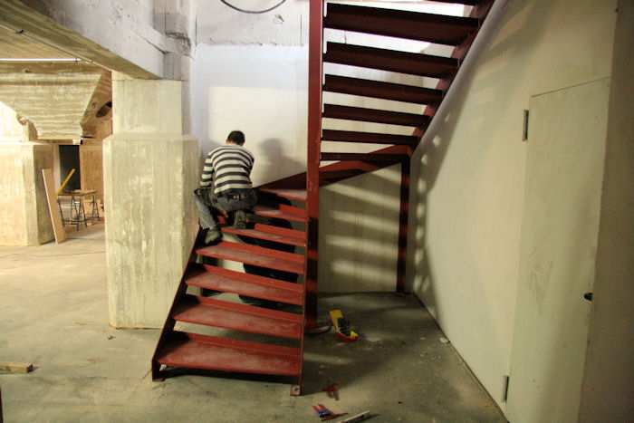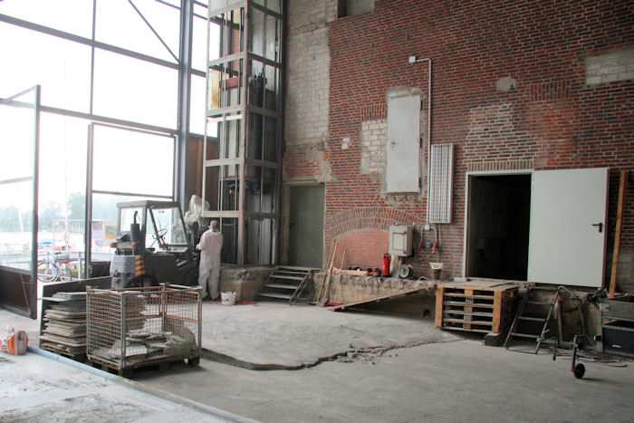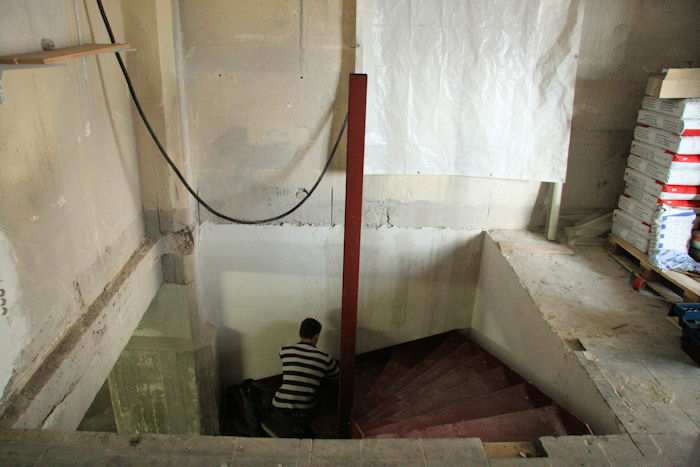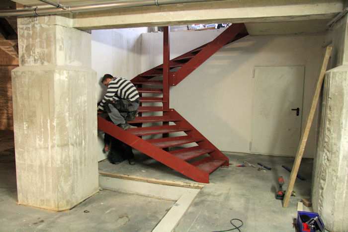 | 02.09.2009 - 8:35 Uhr - Kappeln/Schlei: PK-Speicher im Nordhafen Erd- / Untergeschoss: Einbau einer Stahltreppe Zwischen dem Erd- und Untergeschoss wird gerade eine Stahltreppe eingebaut. Links ist der Zellenkeller zu erkennen. Foto: Eckhard Schmidt - Kappeln - (C) 2009 |