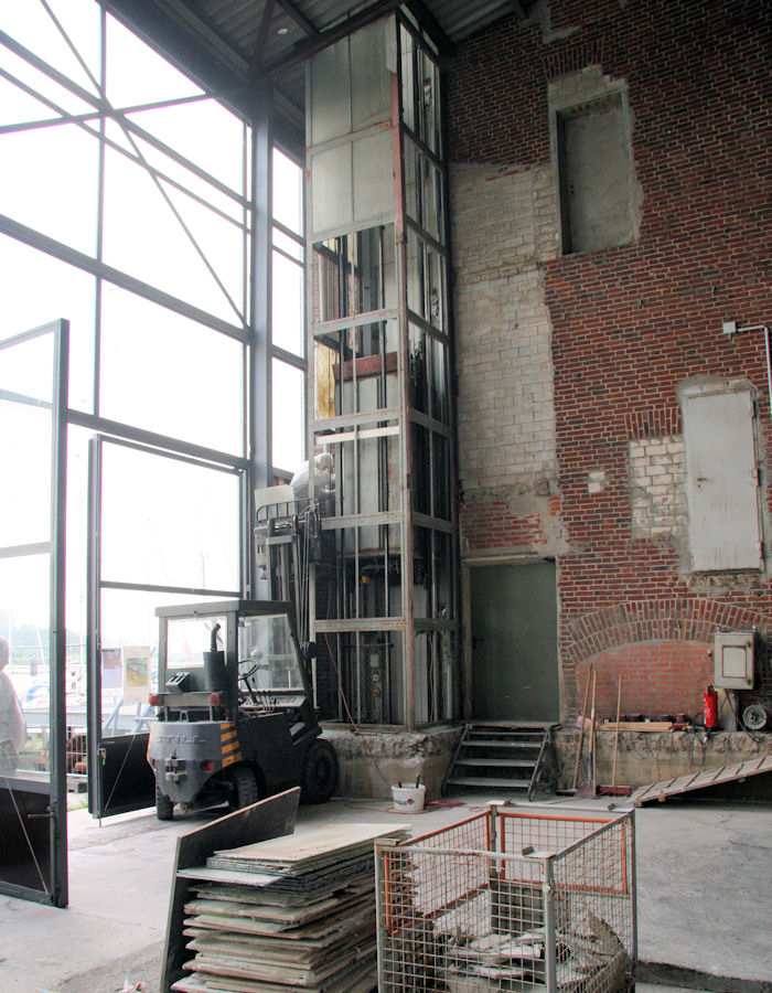 | 02.09.2009 - 8:42 Uhr - Kappeln/Schlei: PK-Speicher im Nordhafen Alter Fahrstuhl an der Nordseite des Speichers Der Fahrstuhlschacht bleibt erhalten. Es wird der Fahrstuhlkorb ausgebaut. Das Metallgerüst des Schachtes wird entrostet und gestrichen. Der Fahrstuhlschacht wird neu verglast. In allen Etagen werden Zwischendecken in den Schacht eingebaut. Foto: Eckhard Schmidt - Kappeln - (C) 2009 |