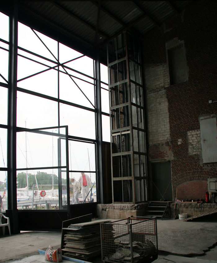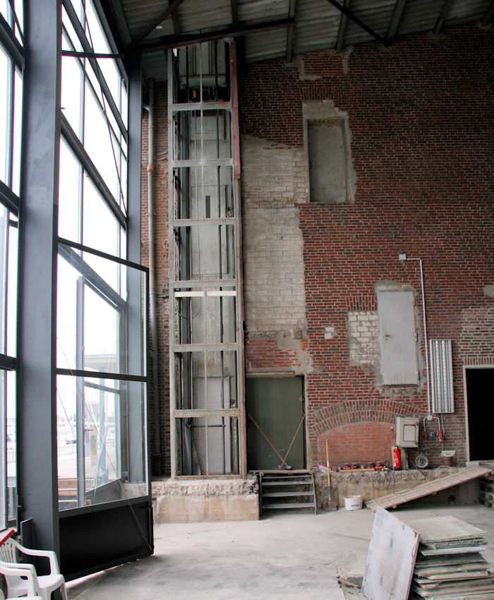 | 03.09.2009 - 8:28 Uhr - Kappeln/Schlei: PK-Speicher im Nordhafen Alter Fahrstuhl an der Nordseite des Speichers Gestern wurden beim Fahrstuhlschacht innerhalb der Halle die Glasscheiben ausgebaut. Jetzt werden die Scheiben oberhalb der Halle ausgebaut. Foto: Eckhard Schmidt - Kappeln - (C) 2009 |
