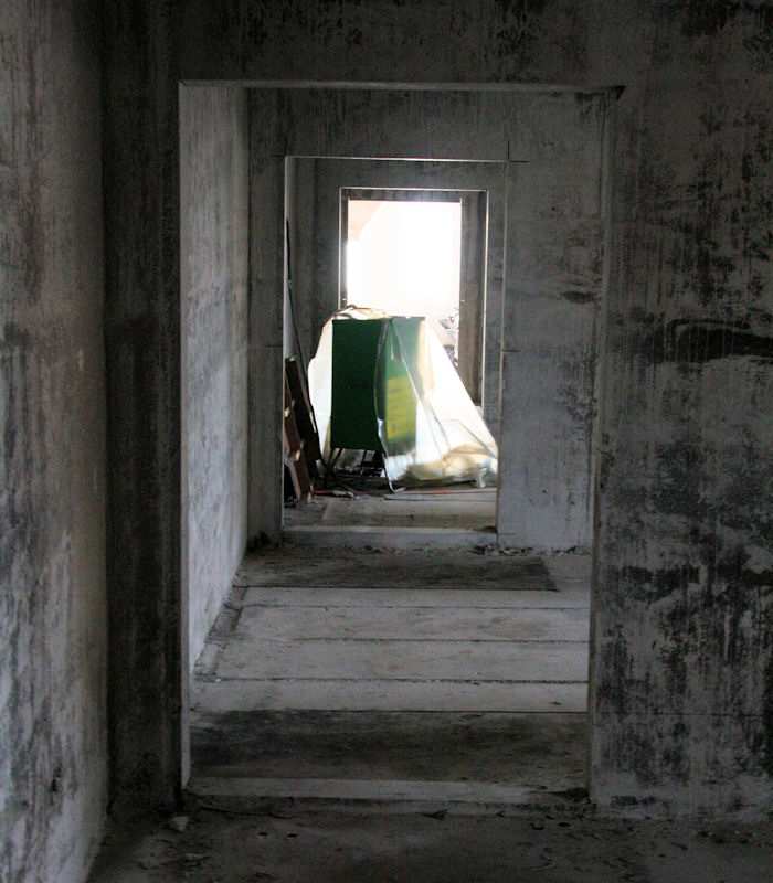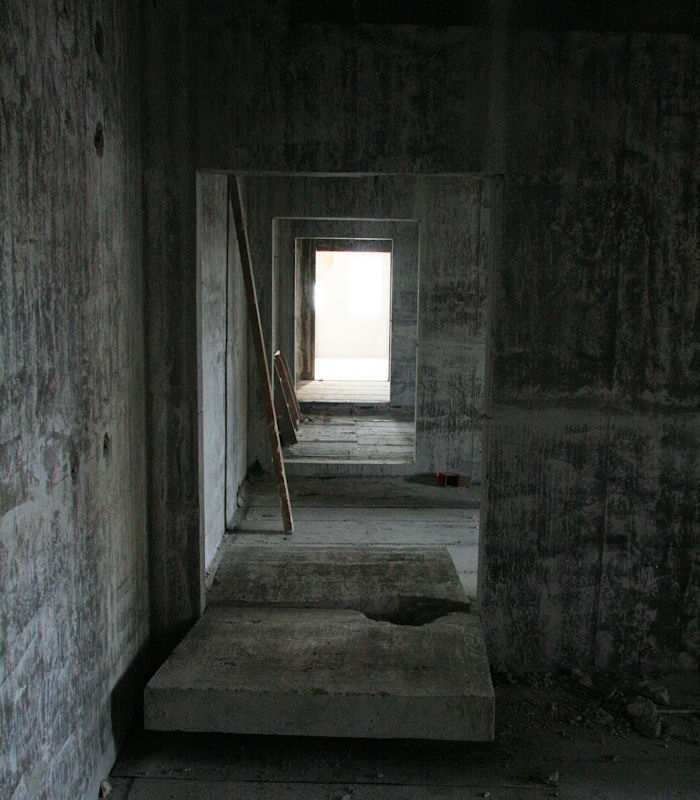 | 06.10.2009 - 9:15 Uhr - Kappeln/Schlei: PK-Speicher im Nordhafen 3. Obergeschoss - Südliche Zellenreihe Alle Öffnungen zwischen den Zellen sind gesägt. Blick von der Zelle 1 durch den zukünftigen Flur in Richtung Ostseite. Foto: Eckhard Schmidt - Kappeln - (C) 2009 |